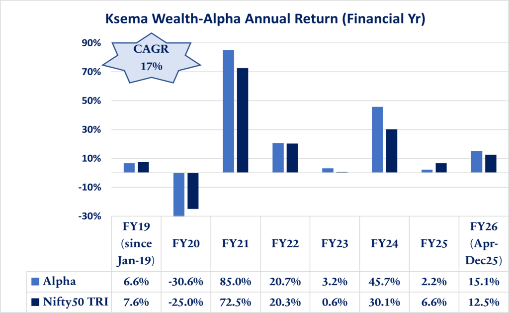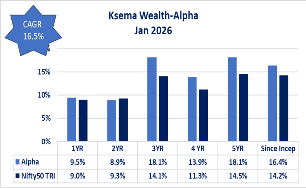 This presentation is for information purposes only and is not an offer to sell or a solicitation to buy any Securities. The views expressed herein are based on the basis of internal data, publicly available information & other sources believed to be reliable. Any calculations made are approximations meant as guidelines only, which need to be confirmed before relying on them. These views alone are not sufficient and should not be used for the development or implementation of an investment strategy. It should not be construed as investment advice to any party. All opinions and estimates included here constitute our view as of this date and are subject to change without notice. Neither Ksema Wealth Private Limited, nor any person connected with it, accepts any liability arising from the use of this information. The recipient of this material should rely on their investigations and take their own professional advice